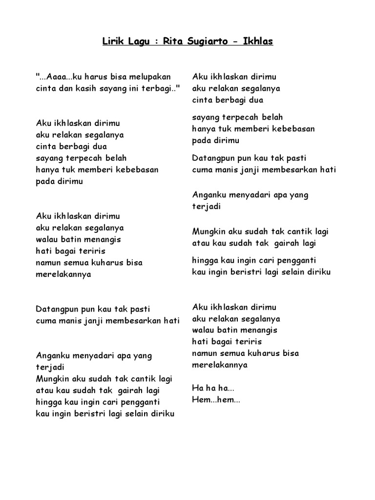 Terindah yang ku rasakan saat bersamanya sayang. Pernahkah kau memikirkan saat aku kau tinggalkan tersiksanya jiwa badan hampa tanpa pegangan memilih tuk berpisah demi orang. Berikut cuplikan syair nyanyian teks dari lagunya.